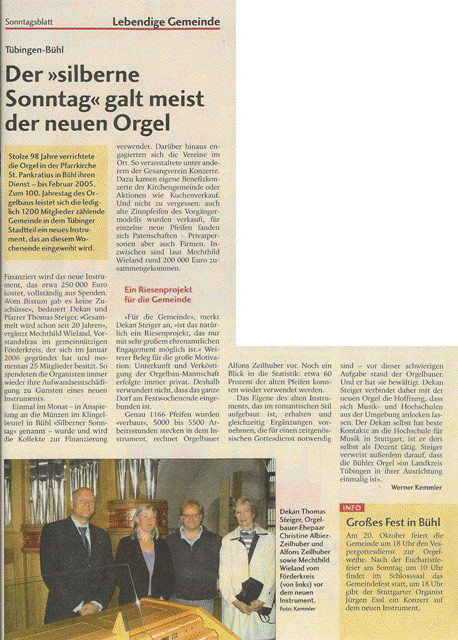 Presseartikel zur Orgelweihe in Tübingen-Bühl